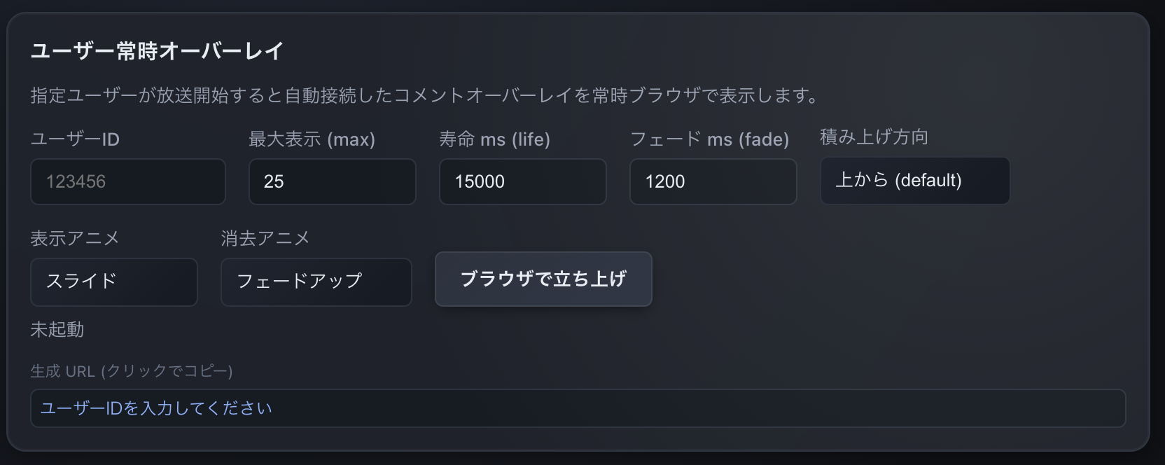 - オーバーレイに表示するコメントの数を指定します。たくさん表示しようとするとブラウザソースの領域を普通にはみ出します。